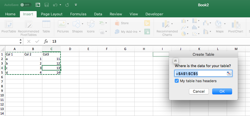 - All the data should be automatically selected, ensure box for “My table has headers” is ticked, click OK