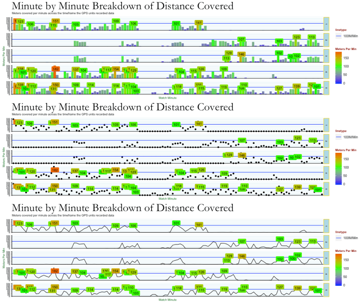 ggplot2/r gives us access to both different plot types as well as the ability to combine multiple plot types in a single plot. There are a wide range of alternative plot types available to view here along with the script to produce them. Plotting multiple graphs together can be useful to give meaning to data while also providing a more attractive visual. Finally the plotly package also gives us the ability to make plots interactive which can be a real advantage with athletes that can live on their phones/ipads
