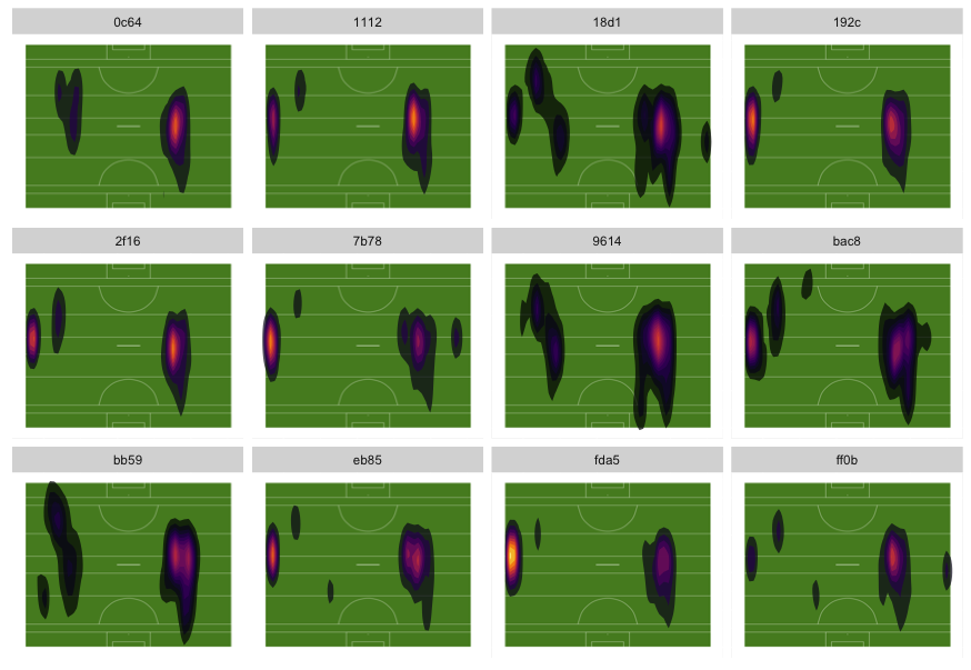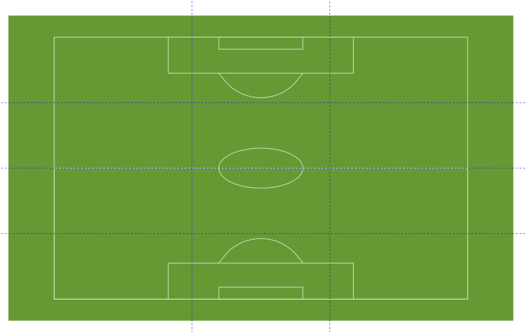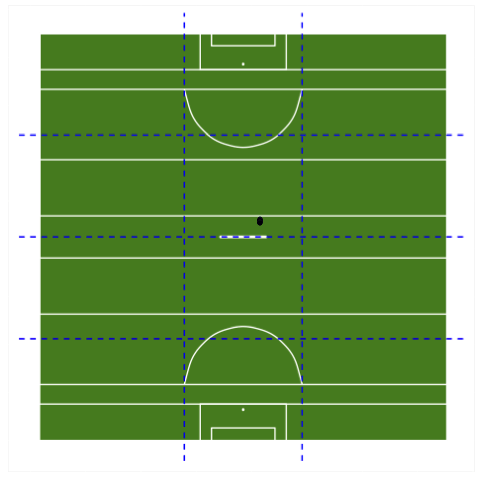 A common step in tactical preparation for team sports is to divide a pitch into different segments and use these segments to provide guidance for where players should be during different phases of a game. The images below are variations of this for different sports, these were created using ggplot2 and the script for them is available here.