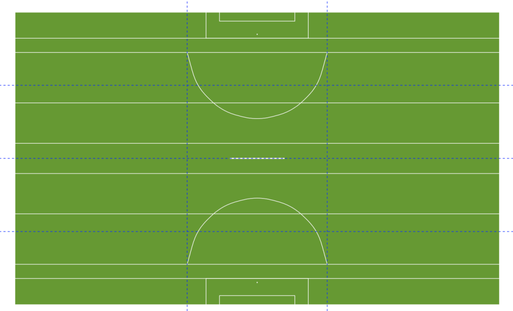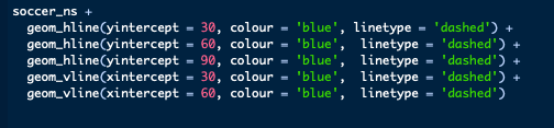We use a combination of geom_vline and geom_hline to draw the lines to create segments on our pitches. Here we set the colour to blue and use a dashed line to signify they are different from the lines on the pitch itself.