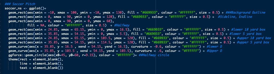 Above shows the script for a soccer pitch which is seven rectangles combined to create the majority of the lines for a pitch. We then use geom_curveto draw the D at the edge of each 18-yard box and finally ggforce::geom_circle for the circle at the halfway. For each rectangle we use the same green colour with the hex code #669933 to create the green fill on the pitch along with #FFFFFFto have white lines.