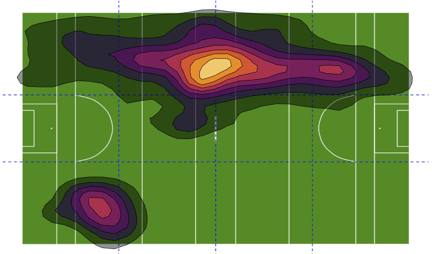 A simple way of creating a link between the tactical and physical data is to look at the time spent in each segment, depending on a player’s position there may be expectancy of a greater proportion time spent in different segments. We can look at creating a visual representation of this by using the longitude and latitude data from GPS and creating a density plot from it. This involves a number of steps with the first being to create an image of the pitch of your given sport.