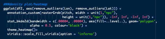 - Here we create our heat map. Technically, we are creating a 2D kernel density estimate. While there are functions available in ggplot2 to build 2d KDEs, I was not able to create it with the look I was aiming for which is why I went with