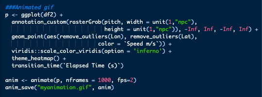 annotation_custom(rasterGrob(pitch, width = unit(1,"npc"), height = unit(1,"npc")), -Inf, Inf, -Inf, Inf)- Bringing our pitch image into ggplot using a combination of
