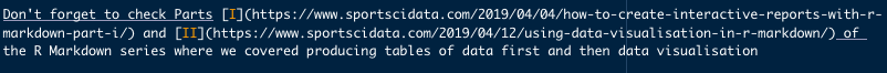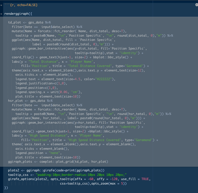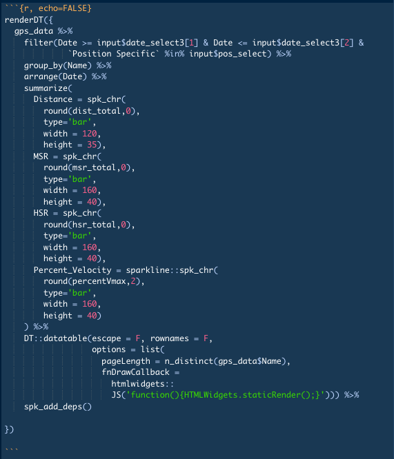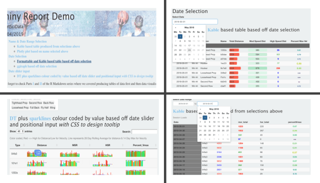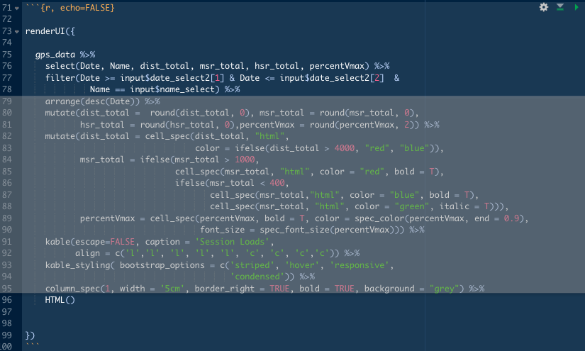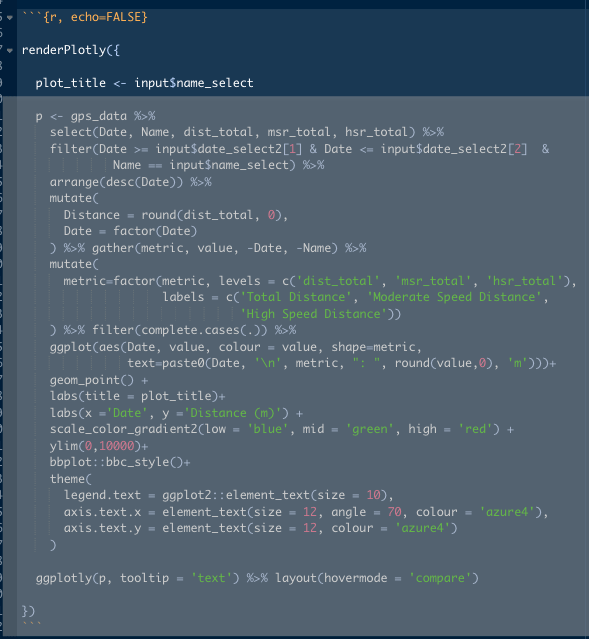 Hopefully I have show you additional steps we can take within R Markdown to add value for the end-user through shiny reactive elements, markdown and CSS. If you have thoughts or comments about the above, feel free to leave a comment below or through twitter @SportSciData. In the next article in this series, we will cover building a calendar heat map in R Markdown, then combine it with a shinyApp to build on the shiny reactive elements we covered here.