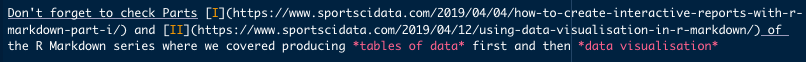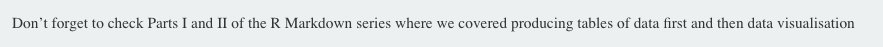 While we are utilising R Markdown to build our reports, it relies on Markdown to create a large amount of the document. We can use Markdown to add and format text between our report elements. While we will cover a small number of elements here, you can read here or here for further options.