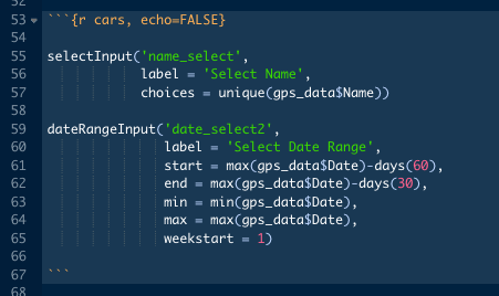 We have a range of options which allow the user affect the report, we will cover a few of them here and others can be viewed at this site. In order to use the data from an input option we name the option within the function and then refer to it using input$inputname.