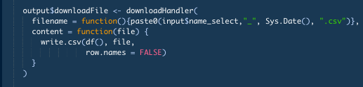 content = function(file) {write.csv(df(), file,row.names = FALSE)})- Create the content that will exist in our download using