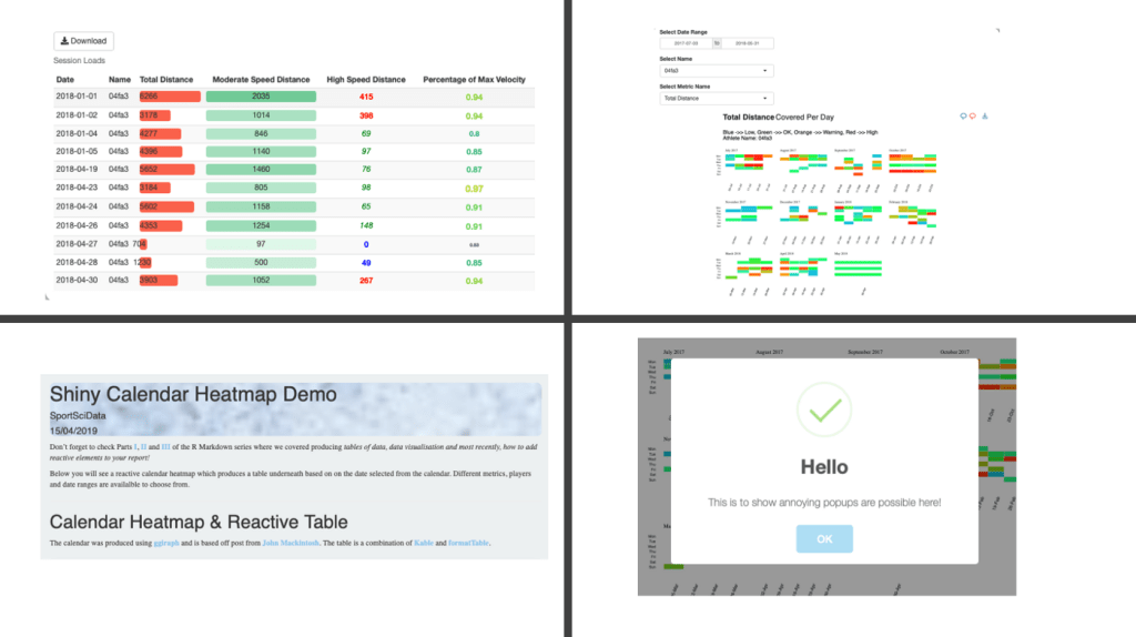 In our R Markdown series to date, we have covered initial report design looking at tables of data along with data visualisation. We followed that up by adding shiny reactive elements to our report along with CSS to design the aesthetics. Now we are going to combine many of those elements and look at how we can create a calendar heatmap for load metrics. As we are going to use click events here, we will also take our first steps into shiny application development.