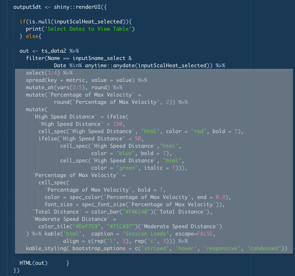 We have one last step to take before we are finished here. If we leave the table render in its current format, there will be a error message present until dates are selected. By adding an “if else” statement at the beginning we can avoid it. Here we we will say to print “Select Dates To View Table” if the click input is empty. If it isn’t empty, print the table.