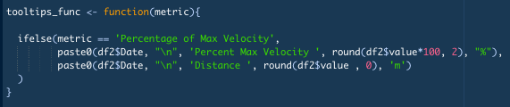 paste0(df2$Date, "\n", 'Percent Max Velocity ', round(df2$value*100, 2), "%"),- When our ‘if’ statement is positive, our tooltip will be the date plus our percentage rounded to two decimal places, multiple by a hundred and a percentage sign added