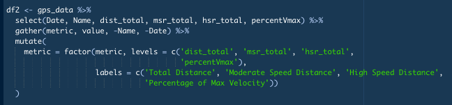 mutate(metric = factor(metric, levels = c('dist_total', 'msr_total', 'hsr_total','percentVmax'),labels = c('Total Distance', 'Moderate Speed Distance', 'High Speed Distance', 'Percentage of Max Velocity')))- Change metric type variable to be a factor with labels
