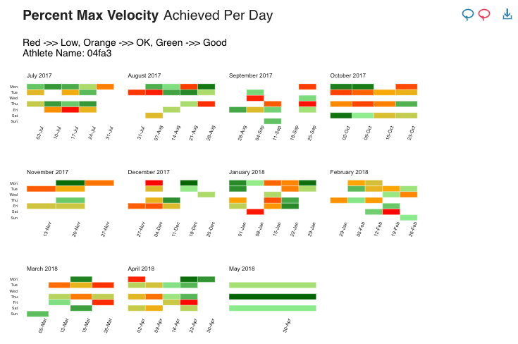 sub_vel <- paste0('Red ->> Low, Orange ->> OK, Green ->> Good\n' , 'Athlete Name: ', df$Name)if_else(df$metric == 'Percentage of Max Velocity',sub_vel,sub_dist)}- Single